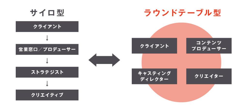 ストラテジックプランナー、コンテンツクリエイター・プロデューサー、キャスティングディレクターなど、様々な職種が一堂に会すラウンドテーブル型を採用することで、ブランドが抱える課題に合わせて、それぞれの視点を持ち寄ったディスカッションができ、戦略から企画、制作、実行までを見通したアイデアを生むことができます。