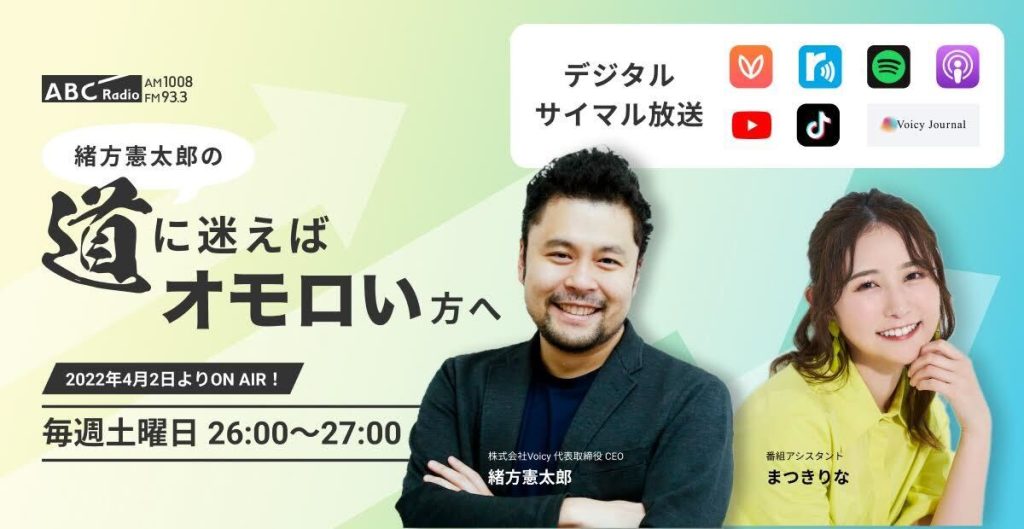 株式会社Voicyが音声ソリューション事業の一環として、「音声DXプログラム」の提供を開始。その第一弾であるABCラジオと連携したラジオ番組「緒方憲太郎の道に迷えばオモロい方へ」にまつきりながアシスタントとして出演します。